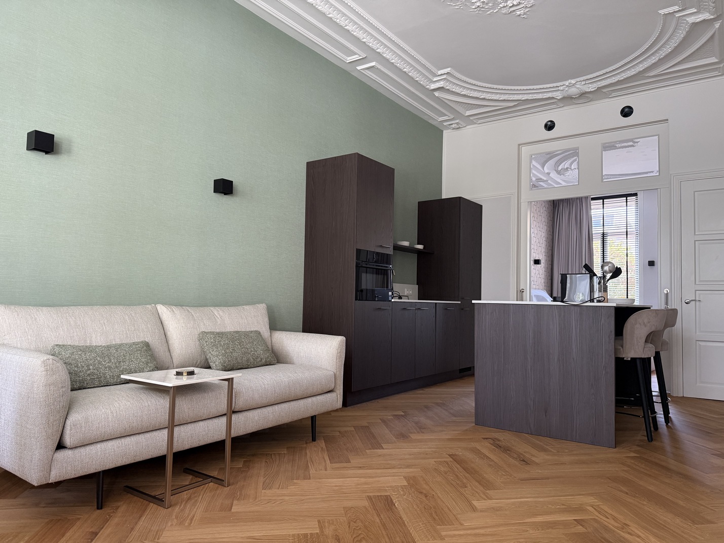 - This apartment has beautiful monumental ceilings and monumental ensuite doors between the living room and bedroom.